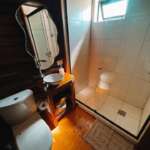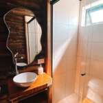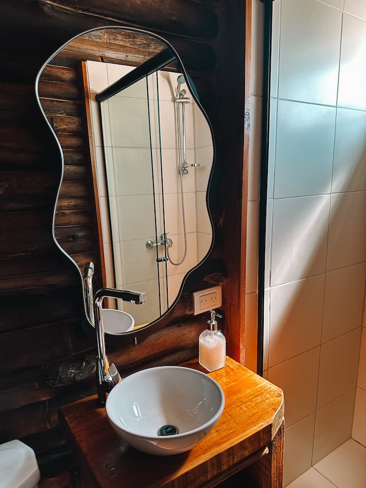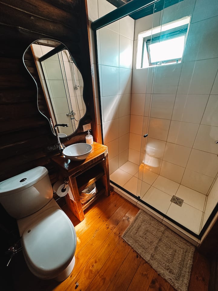 El baño es cómodo y cuenta con ducha con mampara. Se brindan en dispensers, productos de aseo personal: jabón líquido, shampú y crema de enjuague.