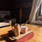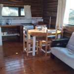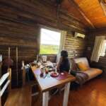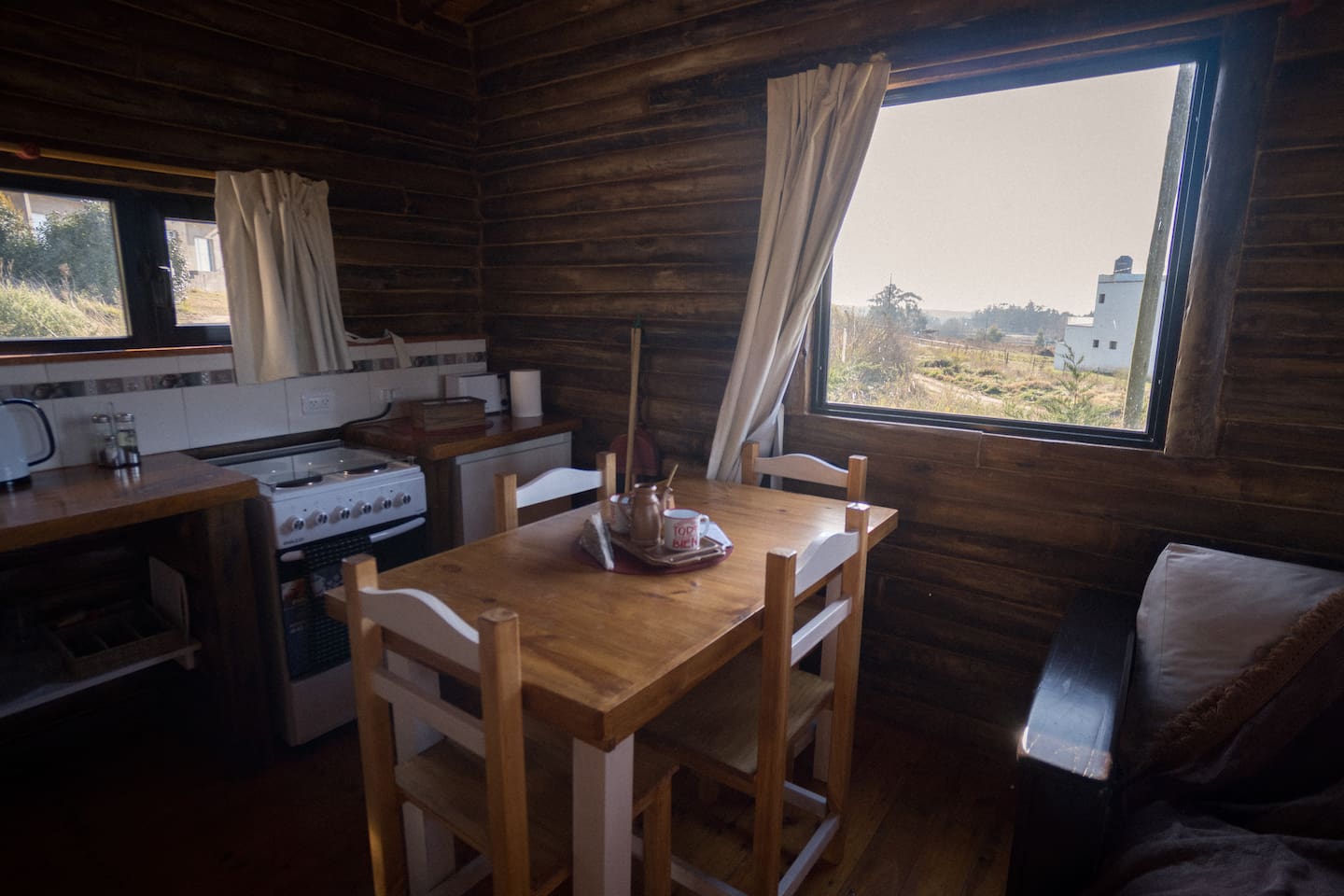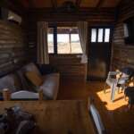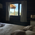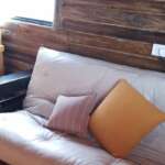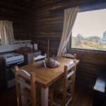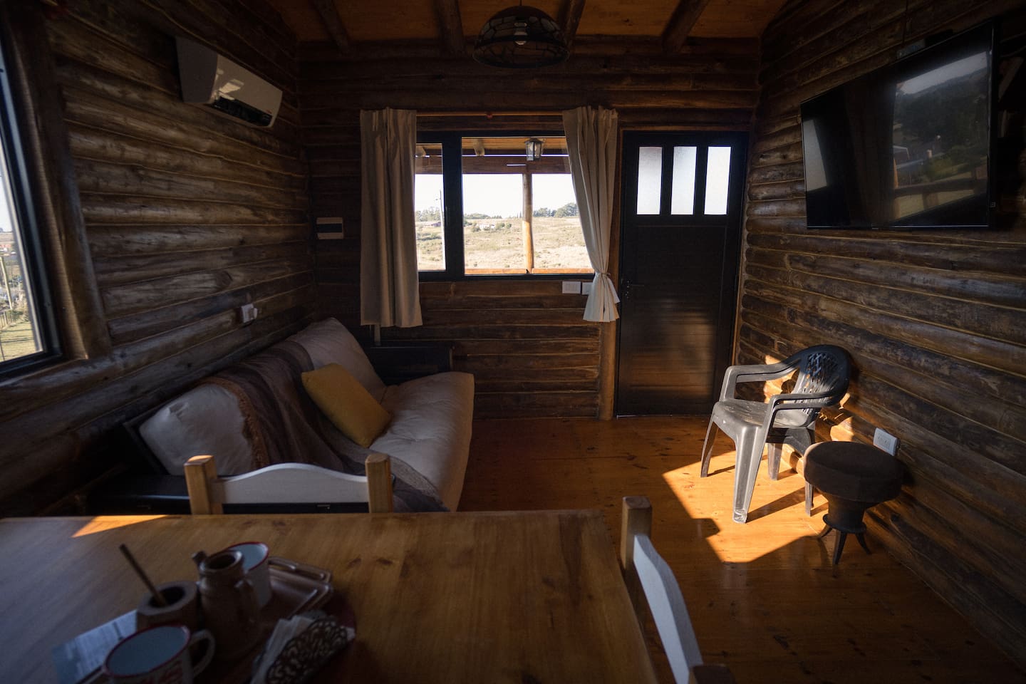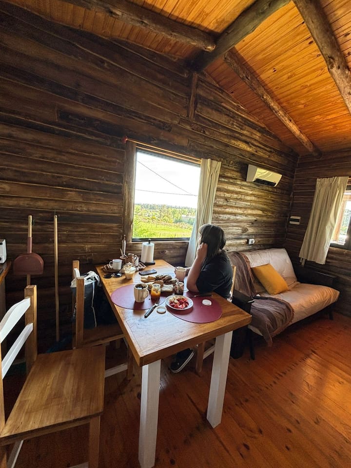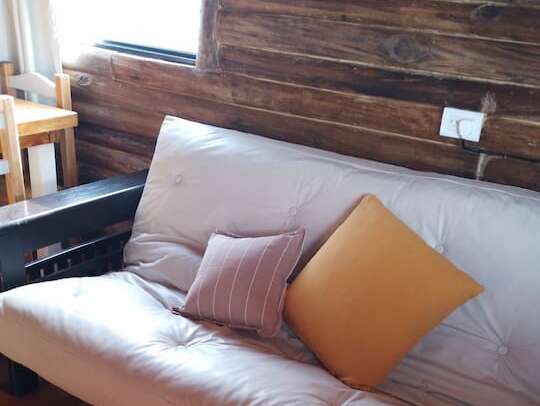 Al abrir la puerta de la cabaña descubrirás una ambientación acogedora con deco minimalista. El estar muy luminoso, también te ofrece hermosas vistas del exterior. Un cómodo diván cama se ubica frente al TV led de 43″.