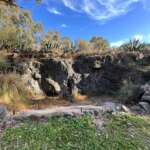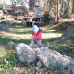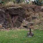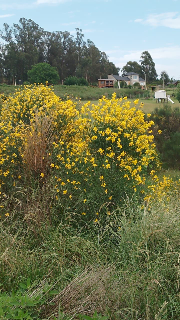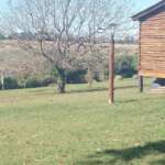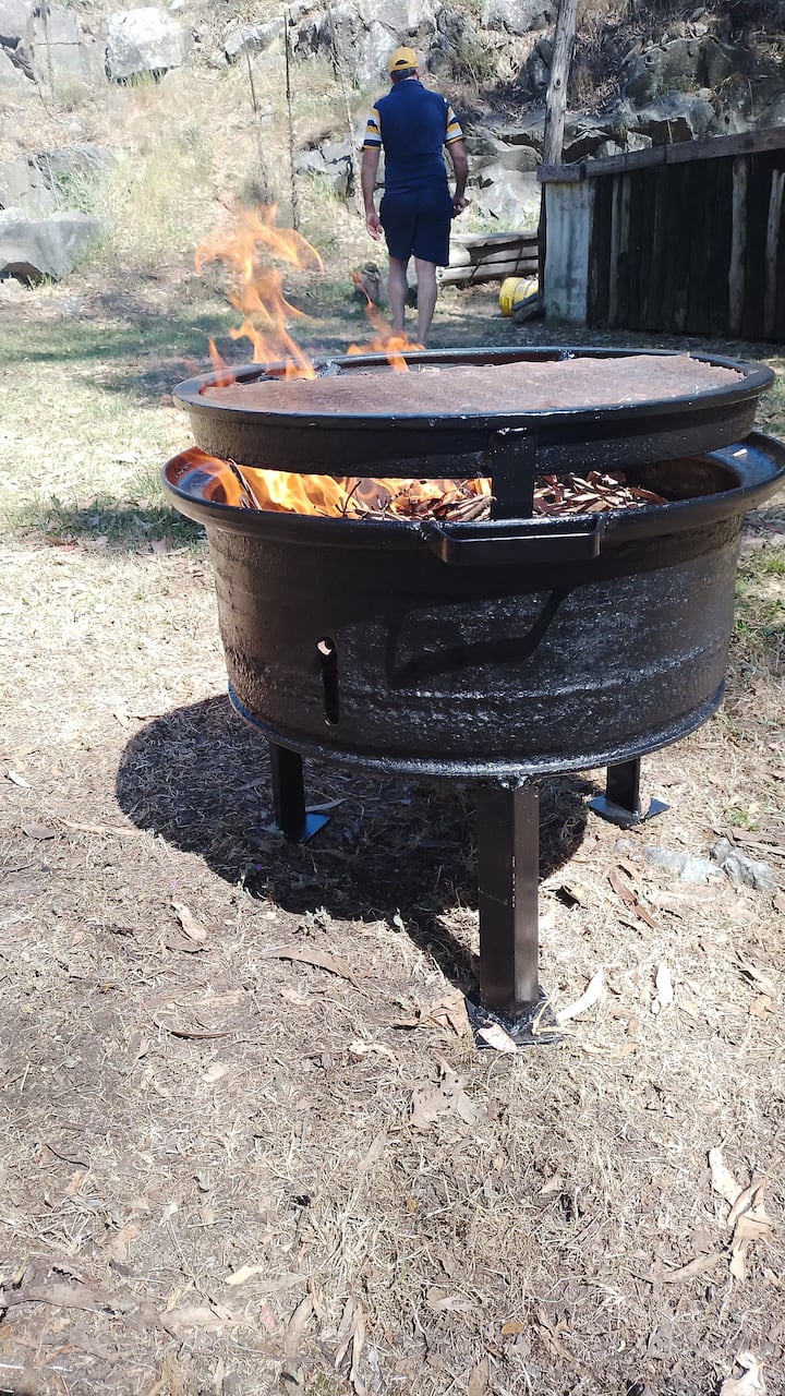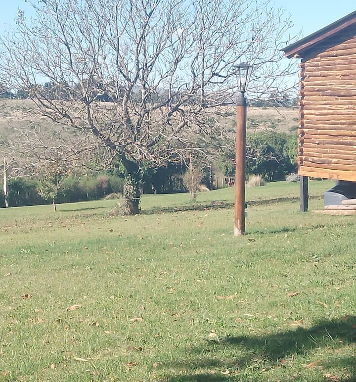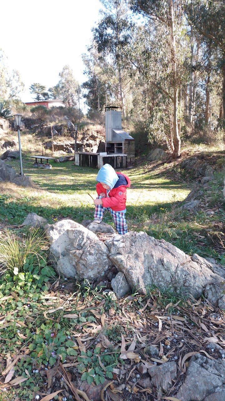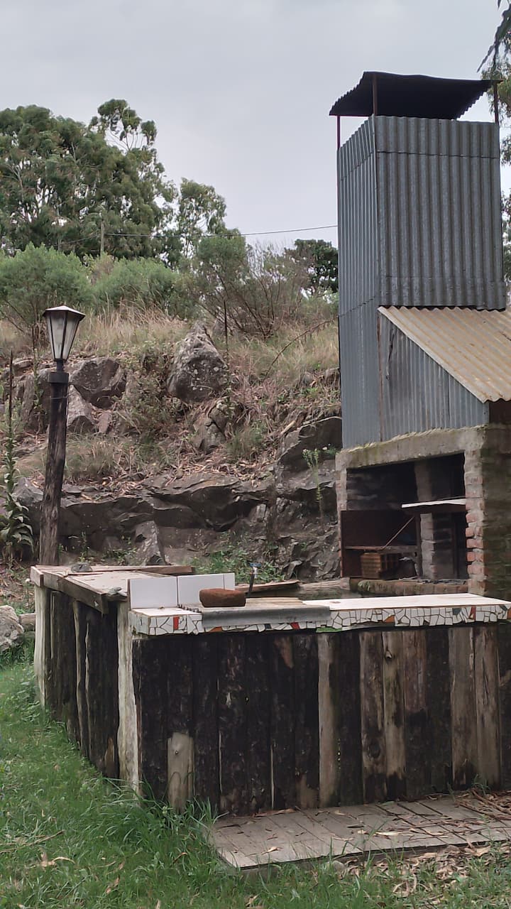 La cabaña se emplaza en un predio amplio, con monte y un espacio de parrilla ubicado en un antiguo frente de cantera.