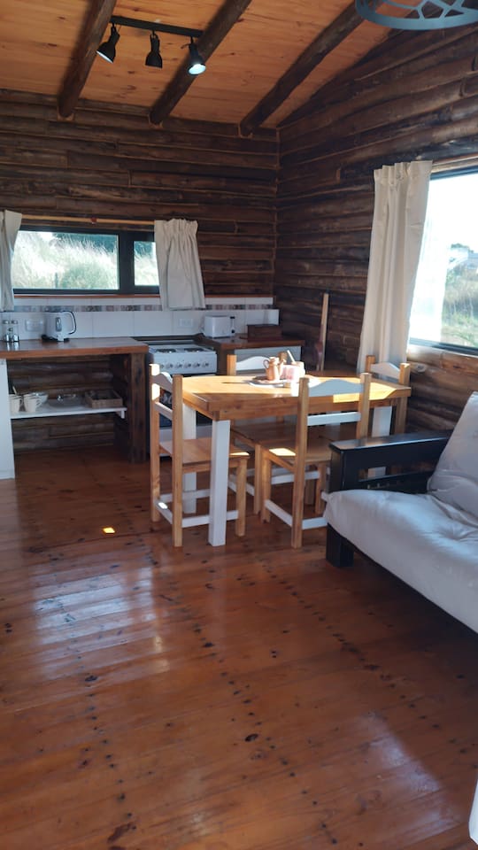 En la otra mitad del estar se encuentra el sector comedor con mesa y 4 sillas, además del equipamiento de hornallas, tostadora, pava eléctrica, horno y heladera con freezer. Cuenta con vajilla completa y utensilios.